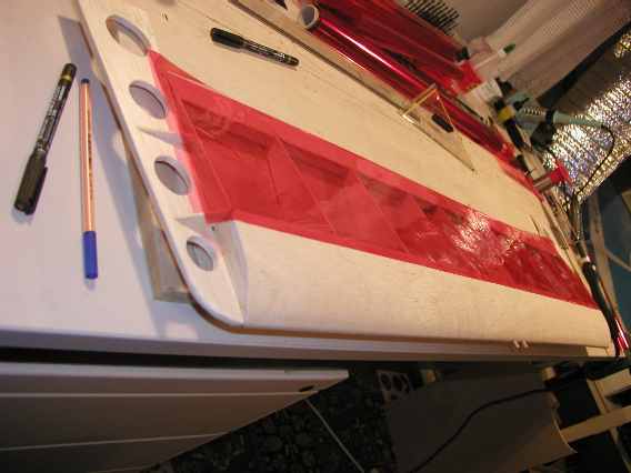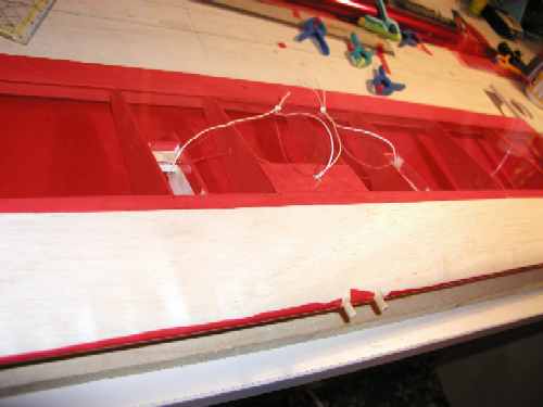 Vor dem Bespannen der Unterseite sollte man Schnüre einlegen, damit man später problemlos die Servokabel durchziehen kann, wenn die Servos montiert werden. |