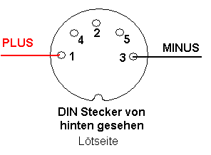 Kabel (Minuspol) an Pin 3 des DIN-Steckers löten, dann entsprechende