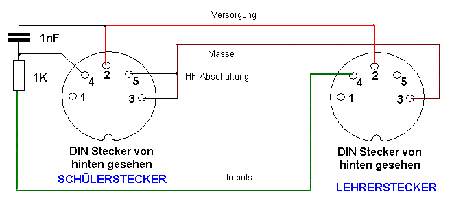 Pinbelegung: Am Schülerstecker werden der 1K Widerstand und der 1N0 (also 1nF) Kondensator eingelötet. Die Bauteile kann man in den Stecker einbauen. Ganz wichtig ist die Brücke zwischen 3 und 5 im Schülerstecker - sie schaltet den HF-Teil des Schülersenders ab. Also nicht vergessen! Der Lehrerstecker hat keine Bauteile drinne. Vor dem Löten werden die Ferritringe ins Kabel auf jeder Seite mit etwa 4-5 Windungen (am besten so viel wie Kabel durch den Ring paßt) eingeschleift. TIP: Wer eine alte Computertastatur "schlachten" kann, findet dort ein schönes Spiralkabel was sich hervorragend für das Lehrer-Schüler Kabel eignet!