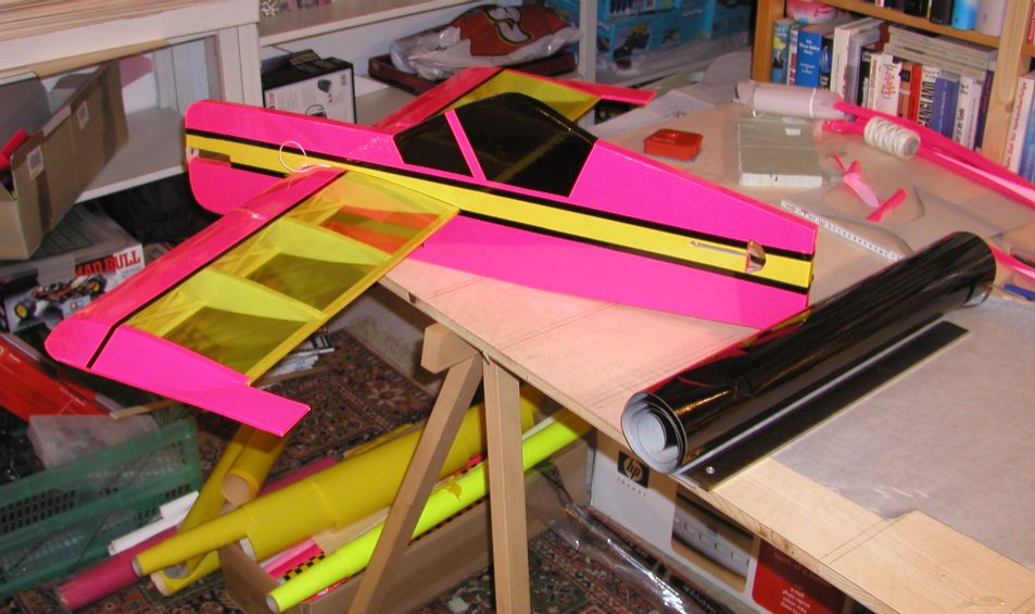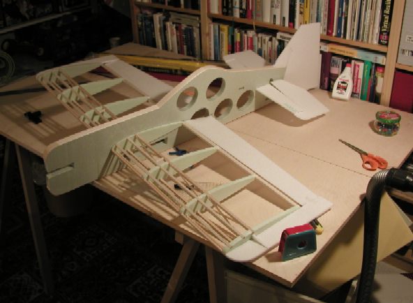 Balsa gebaut. Es hat einen Rumpf aus 20mm Styrodur (oder Styropor) und Rippen