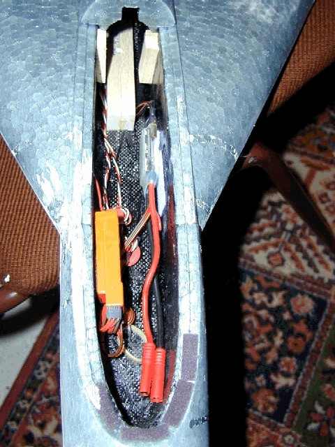 Die hervorragende Bauanleitung läßt keine Fragen offen. Alle Verklebungen wurden mit Sekundenkleber und Aktivatorspray sind problemlos. Statt des "Plastikbechers" für den Rumpfausbau habe ich allerdings ein 100g/m2 Kohlegewebe mit dünnflüssigem Sekundenkleber "einlaminiert". Diese Maßnahme hatte sich schon beim Picojet Combat bewährt - das ist zwar etwas teurer aber auch erheblich robuster. Als Akkuauflage wurde ein Keil aus 10mm Balsa eingeklebt. Die Fixierung des Akkus erfolgt dann mit einem kleinen Keil aus Schaumgummi an den Seitenwänden.