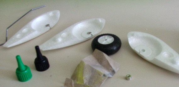 Hier ist die Befestigungsplatte für das Fahrwerk bereits am Rumpf aufgeklebt und man sieht die für das Fahrwerk selbst benötigten Teile. Beim Bau des Fahrwerks sollte man sich Zeit lassen und nicht zuviel Sekundenkleber benutzen, damit sich die Räder hinterher auch drehen.. |