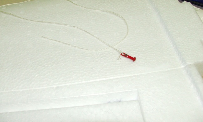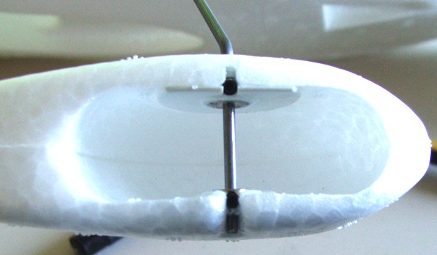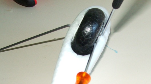 Zum Durchziehen der Servokabel habe ich eine Schnur mit einem kleinen Gewicht versehen und einfach durch die Servoöffnung eingefädelt und durch Flächenbohrung fallen lassen, bis es an der Wurzelrippe wieder rauskommt. |