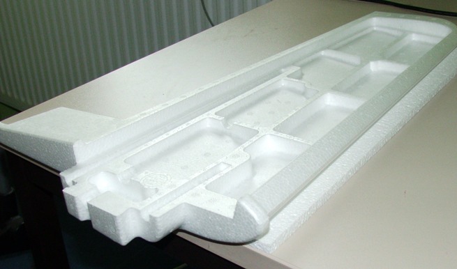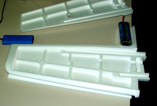 Die Tragflächen des Acromaster sind hohl und daher sehr leicht, aber trotzdem stabiler als bei der Skycat. Allerdings muß man hier das ganze aus zwei Hälften zusammenbauen. Das ist aber nicht schwer zu bewerkstelligen.. Die obere Tragflächenhälfte wird an eine Tischkante gelegt damit der Flächenübergang nicht stört und die ganze Fläche plan auf dem Tisch aufliegt. Dann wird mit dem Styroporstreifen aus dem Baukasten unterlegt damit nichts wackelt. |