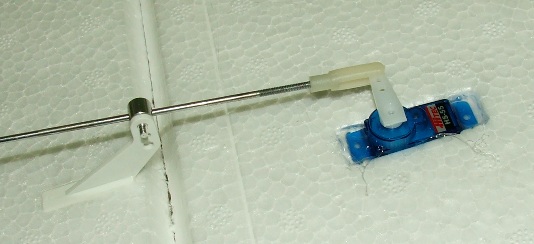 Das Servo wird wieder mit Heißkleber montiert. Ich habe das HS-55 als Flächenservo benutzt, weil ich dieses Servo gerade herumliegen hatte. Bei einem Neukauf würde ich aber das etwas robustere HS-65 einsetzen. Das wiegt zwar 4g mehr, hat aber ein deutlich stabileres Getriebe und Kugellager. Zum Bild: Das Gestänge wird natürlich noch nach dem Ruderhebel gekürzt und der Servohebel bekommt noch seine Befestigungsschraube. |