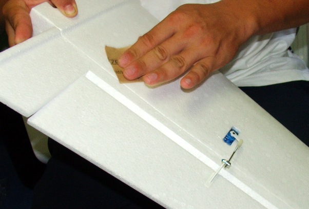 Zuerst wird die Tragfläche mit 500er Schleifpapier überschliffen um die kleinen Unebenheiten auf der Fläche zu beseitigen. Das muß zwar nicht sein, aber der Dekorbogen liegt dann einfach besser an und bekommt auch nicht so leicht Blasen. |