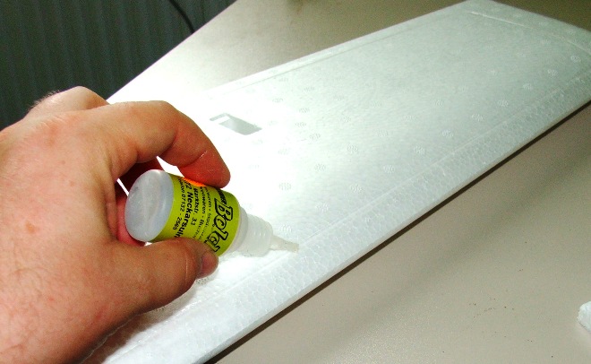 Die Tragflächen beschweren, damit nichts mehr verrutsch und anschließend zügig eine Menge dickflüssigen Kleber auftragen. Damit das schnell geht, habe ich die Spitze der Sekundenkleberflasche großzügig abgeschnitten, sodaß ich eine ca. 1,5mm große Öffnung habe. Damit kann man schnell den Kleber aufbringen. Dann das Unterteil auflegen und festdrücken, bis der Sekundenkleber abgebunden hat. Das dauert hier ein wenig länger, weil es eine große Fläche ist, also lieber mal eine Minute länger "Hand auflegen" |