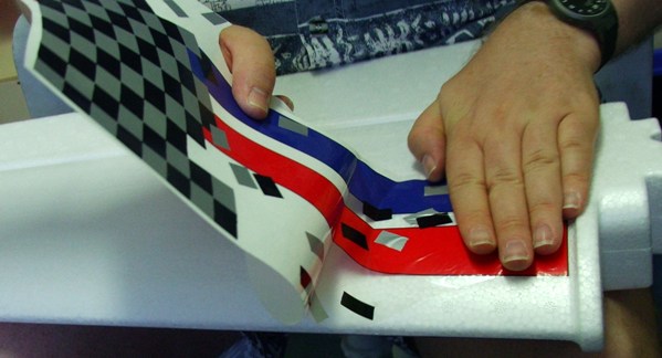 Um den Aufkleber auf den Rumpfrücken aufzubringen, sollte man am besten zu Zweit arbeiten. Dann kann eine Person die Schutzfolie abziehen und der andere drückt den Dekorbogen schrittweise fest.