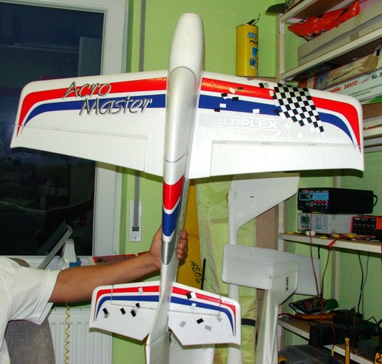 Der Bau des Modells hat bis hierher etwa 5 Stunden gedauert, davon ungefähr 45 Miuten für diverse Lötarbeiten (Servoverlängerung, Motorstecker usw.) und die Verarbeitung des Dekorbogens (Ausschneiden inklusive Aufkleben) nochmals knapp 2 Stunden. Insgesamt also 7 Stunden. |