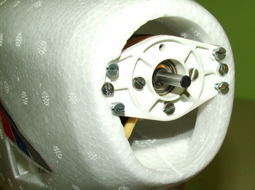 Mein Antrieb ist ein AXI 2820/12 - ich hatte den zufällig noch von einem anderen Projekt herumliegen. Akku ist ein E-TEC Lipoly mit 3 Zellen 1800mA Als Regler kommt ein Hacker / JETI 70A zum Einsatz. Der Regler ist eigentlich überdimensioniert, aber ich hatte den gerade noch in der Schublade. Der im Baukasten mitgelieferte Motorspant paßt perfekt - alle Bohrungen an der richtigen Stelle. |