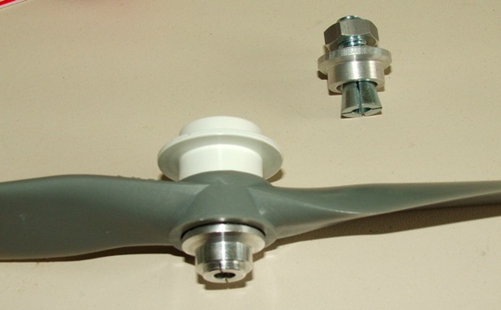 So wird die Starluftschraube montiert. Ein Spannzangenmitnehmer von Aeronaut paßt perfekt. Das weiße Teil dient zur Befestigung des Spinners. |