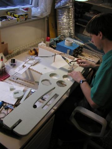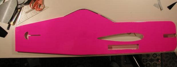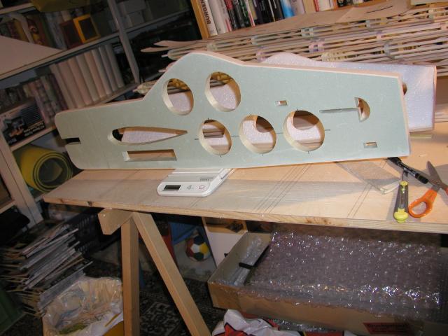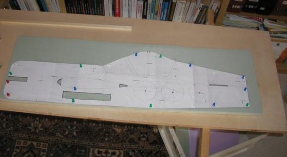 Eine große Pappschablone mit allen Ausschnitten für den Rumpf wird mit Nadeln aufgesteckt. Dann kann direkt mit einer Styroschneidevorrichtung alles ausgeschnitten werden. |