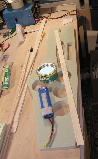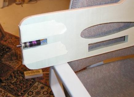Dann wird der fertig ausgeschnittene Rumpf entlang der Schmalseiten mit 2mm Balsa beklebt. Dabei den Rumpf plan aufliegen lassen, damit dann alles gerade ist. Als Klebstoff empfehlen wir UHU-POR. Danach kann der Motorspannt aus 2mm Sperrholz eingeklebt werden. Am besten macht man das zusammen mit dem geplanten Motor, um sicherzustellen daß alles paßt. |