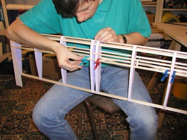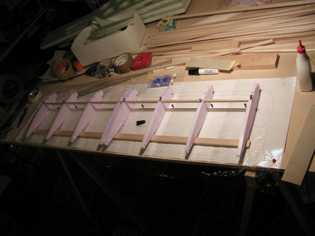 Dann Holme auf den Plan und Rippen mit Ponal Express einkleben. Dabei hinten unterlegen. damit die Rippen sauber aufliegen. |